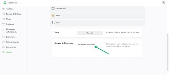 Para configurar un Mensaje de Bienvenida, ve a Ajustes > Canales > Voz.