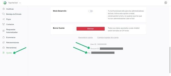 Puedes obtener el ACCOUNT_ID y el ACCOUNT_KEY yendo a Ajustes > General. Los encontrarás en la parte inferior de la página.