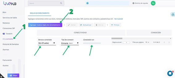 Después de añadir tu número de teléfono a AudioCodes, necesitas conectar el número de teléfono a tu bot de AudioCodes. Ve Enrutamiento y haz clic en el botón Añadir.