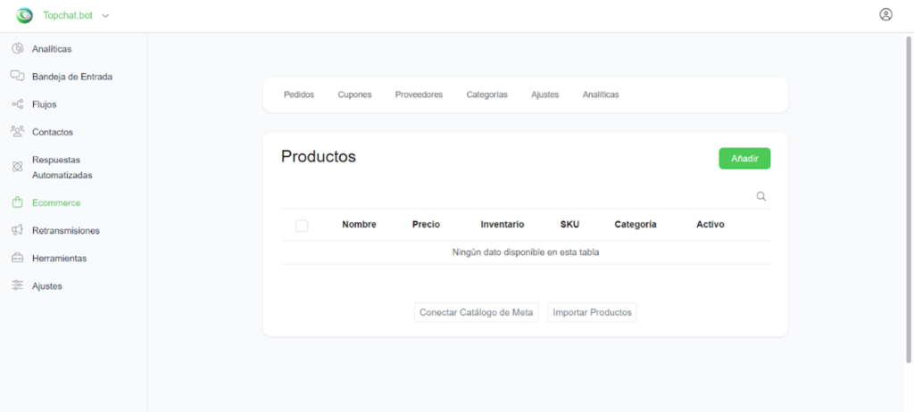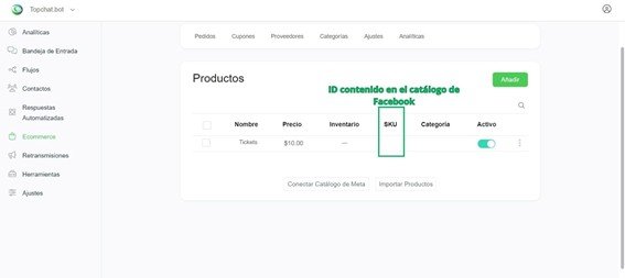 - Conecta Topchat.bot a tu Catálogo: Ve a Menú > Ecommerce y haz clic en el botón “Conectar Catálogo de Meta” y sigue las instrucciones.
