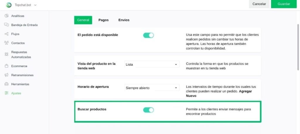 Por defecto, los nombres de tus productos son buscables, lo que significa que tus clientes pueden enviar mensajes para encontrar productos automáticamente. Nosotros manejamos este proceso automáticamente con nuestra IA integrada. Puedes desactivar la búsqueda a nivel de producto o a nivel de cuenta. Los productos con variantes no son buscables dentro de WhatsApp. Para desactivar la búsqueda en tu cuenta, navega a Herramientas > Ecommerce > Configuración > General > Buscar Productos.