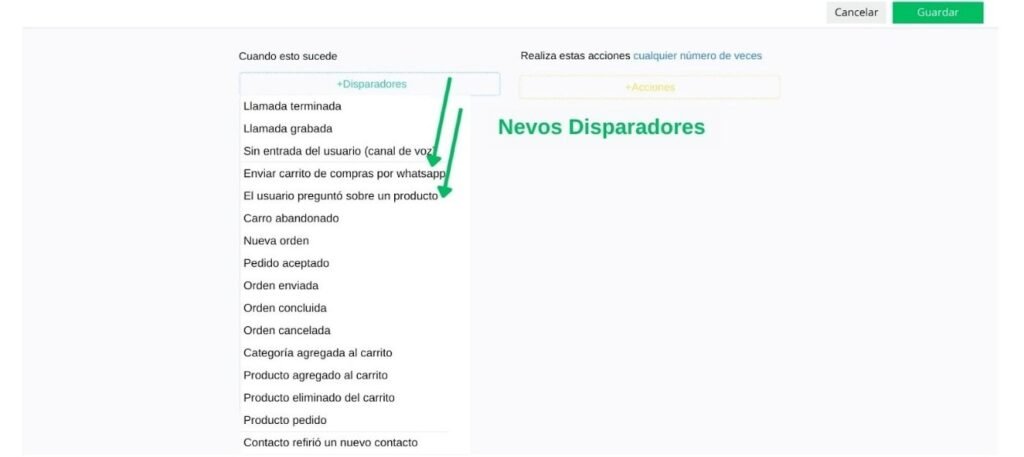 Todos los disparadores relacionados con el comercio electrónico funcionan en el comercio de WhatsApp, excepto “Agregar Producto al Carrito” y “Agregar Categoría al Carrito“. Además, hemos introducido dos nuevos disparadores que funcionan únicamente con el comercio de WhatsApp: