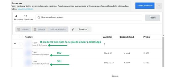 Para productos con variantes, deberás repetir el proceso anterior para todas las variantes. Ten en cuenta que, dentro del bot de WhatsApp, solo se pueden enviar variantes debido a las limitaciones de WhatsApp. No puedes enviar el producto principal que contiene variantes.