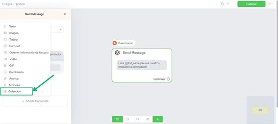 Enviar productos durante una conversación.Colección: Puedes usar el elemento de colección en el creador de flujos para enviar un producto a un usuario. Ten en cuenta que con la colección, no puedes enviar productos con variantes en WhatsApp.