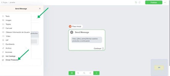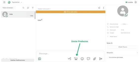 Enviar productos desde el inbox: Desde el inbox, puedes seleccionar fácilmente productos y enviarlos al usuario.