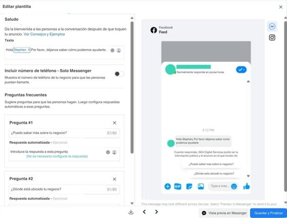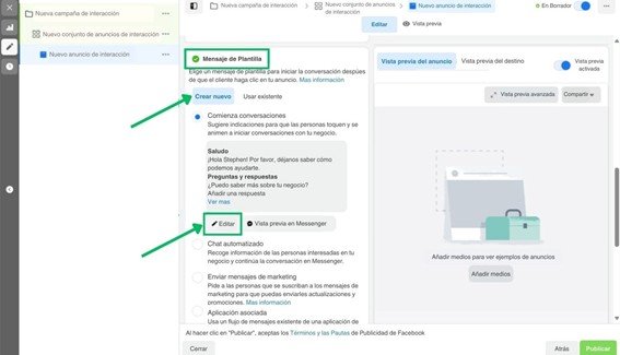 - Después de haber creado tu anuncio, desplázate hacia abajo hasta Plantilla de Mensaje y crea una nueva para Iniciar Conversaciones y haz clic en Editar.
