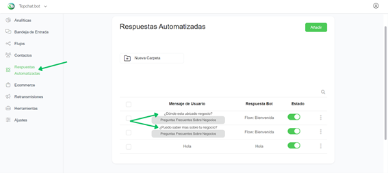 - Copia y pega esa(s) FAQ y crea Palabras Clave en Topchat.bot utilizando esa(s) FAQ como ‘Palabras Clave‘.
