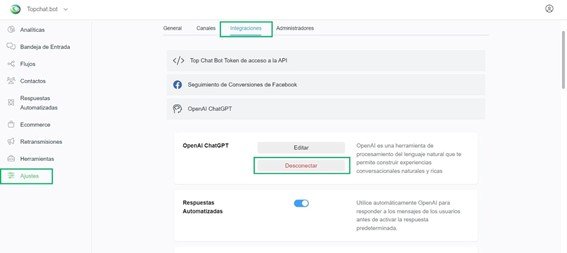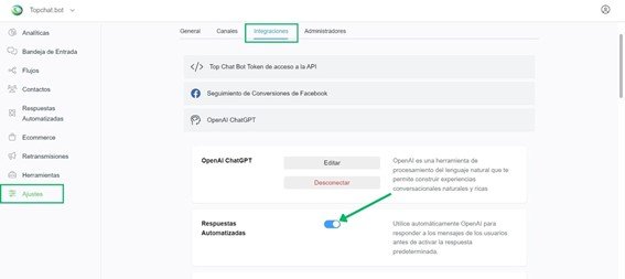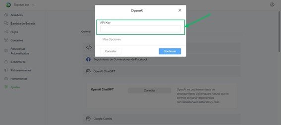 Vuelve a tu cuenta de Topchat.bot. Ve a Configuración > Integraciones > OpenAI. Haz clic en Conectar y pega tu clave API.