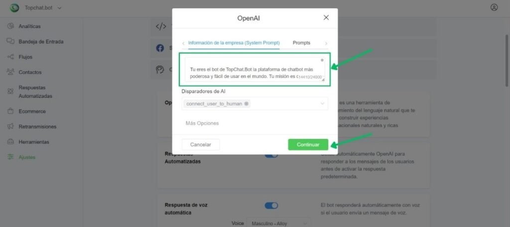 Ve a Configuración > Integraciones > OpenAI. Luego haz clic en Editar. Coloca toda tu información en la sección Información del Negocio (Prompt) y haz clic en Continuar. Asegúrate también de que la ‘Respuesta Automatizada’ esté activada.