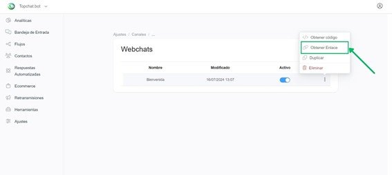 Para probarlo en el chat web, ve a Configuración > Canales > Chat Web, luego haz clic en Administrar. Puedes personalizar tu chatbot web. Una vez que hayas terminado, elige Obtener enlace y haz clic en Copiar.
