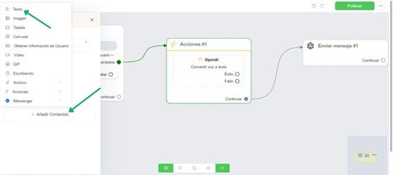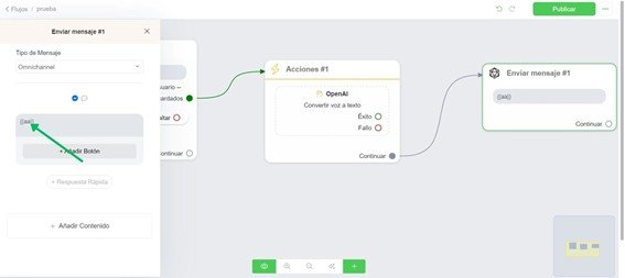 Para transcribir voz usando el constructor de chatbots, inicialmente, vincula OpenAI en el segmento de ‘Integración’. Consulta la documentación sobre cómo integrarse con OpenAI. Después de establecer la conexión, sigue los siguientes pasos: