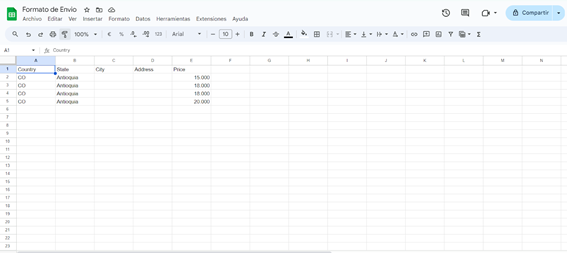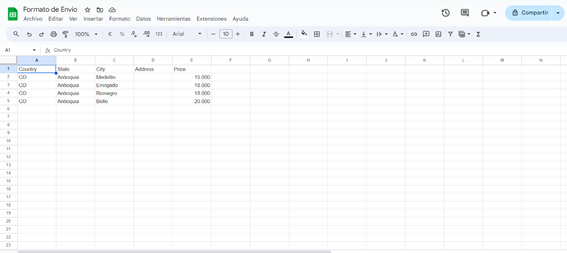 En la columna “Precio” (price), excluye los símbolos de moneda y los espacios. Introduce los valores directamente; por ejemplo, si el costo es 1,000.5 $, simplemente ingresa 1000.5 para una integración fluida y una tarificación precisa.