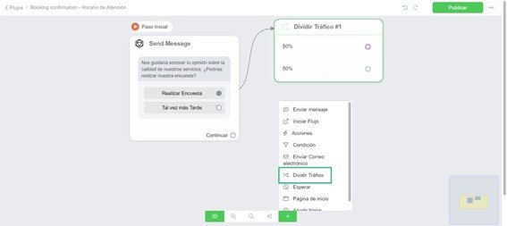 Permite la distribución aleatoria de contactos suscritos a lo largo de varios caminos. Por ejemplo, facilita la experimentación con Mensajes de Bienvenida para descubrir variantes que mejoren las conversiones o probar diversas llamadas a la acción dentro de los Mensajes de Opt-In de las Herramientas de Crecimiento. Los usuarios tienen la opción de crear hasta seis variaciones y gestionar los porcentajes de distribución.