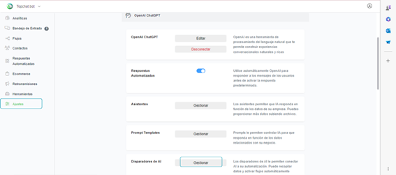 Ve a Ajustes > Integraciones > OpenAI ChatGPT > Disparadores de AI y haz clic en el botón Gestionar