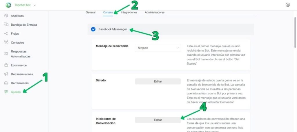 Para crear un rompehielos para tu negocio, navega a Menú > Ajustes > Canales (Messenger/Instagram) > Iniciador de conversación y haz clic en el botón “Editar”.