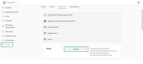 Ve a Topchat.bot > Ajustes > Integraciones > Claude.