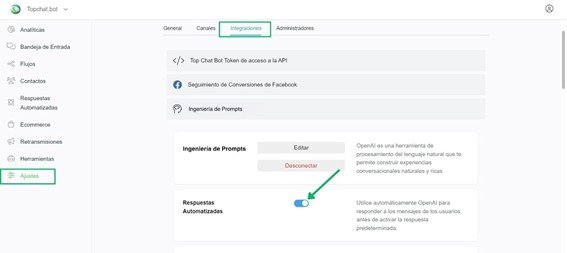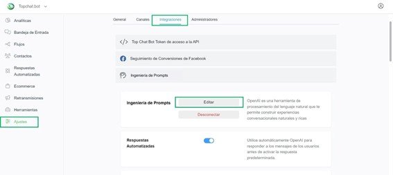 2 – Ve a Configuración > Integraciones > Ingeniería de Prompts (anteriormente OpenAI).