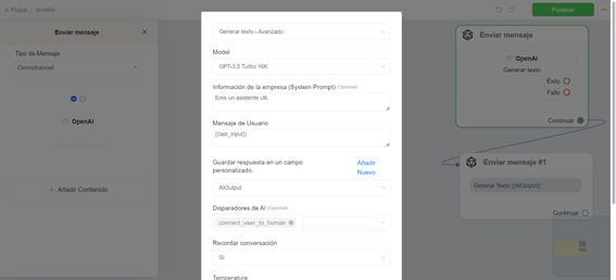 Cada vez que un usuario envía un mensaje a tu chatbot, tu chatbot usará automáticamente ChatGPT para responder al mensaje del usuario. Es posible que quieras trabajar solo con acciones de OpenAI en el constructor de flujo. Puedes desactivar este comportamiento yendo a Configuración > Integraciones > Ingeniería de Prompts (anteriormente OpenAI) y desactivar la opción de Respuesta Predeterminada.